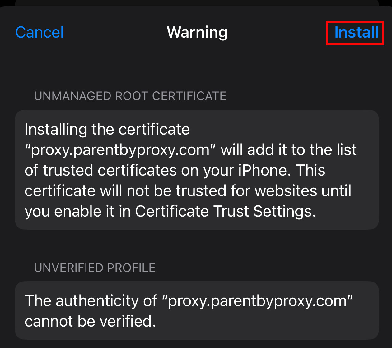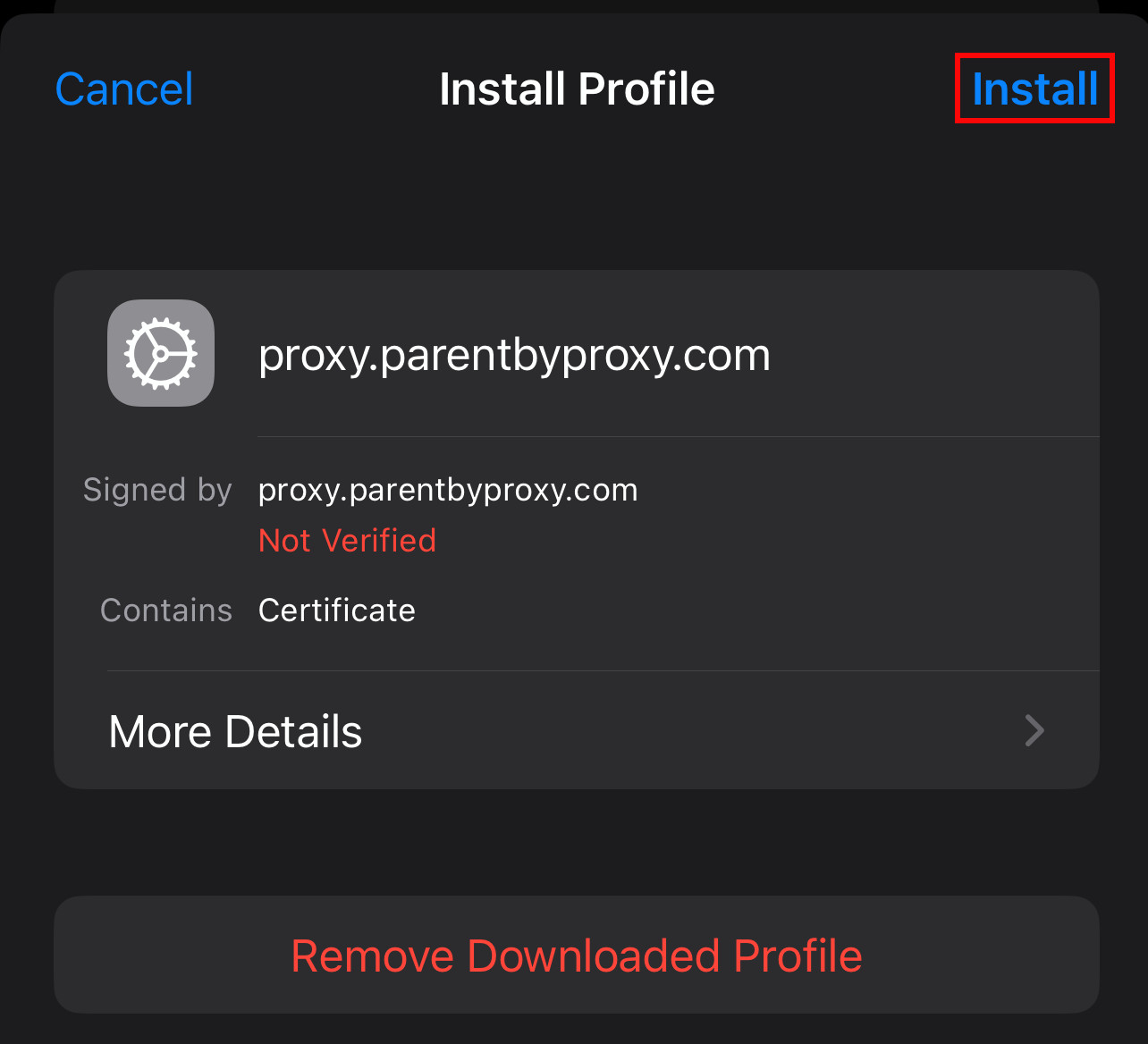 Congratulations, the certificate needed to use the Parent By Proxy service is now installed!